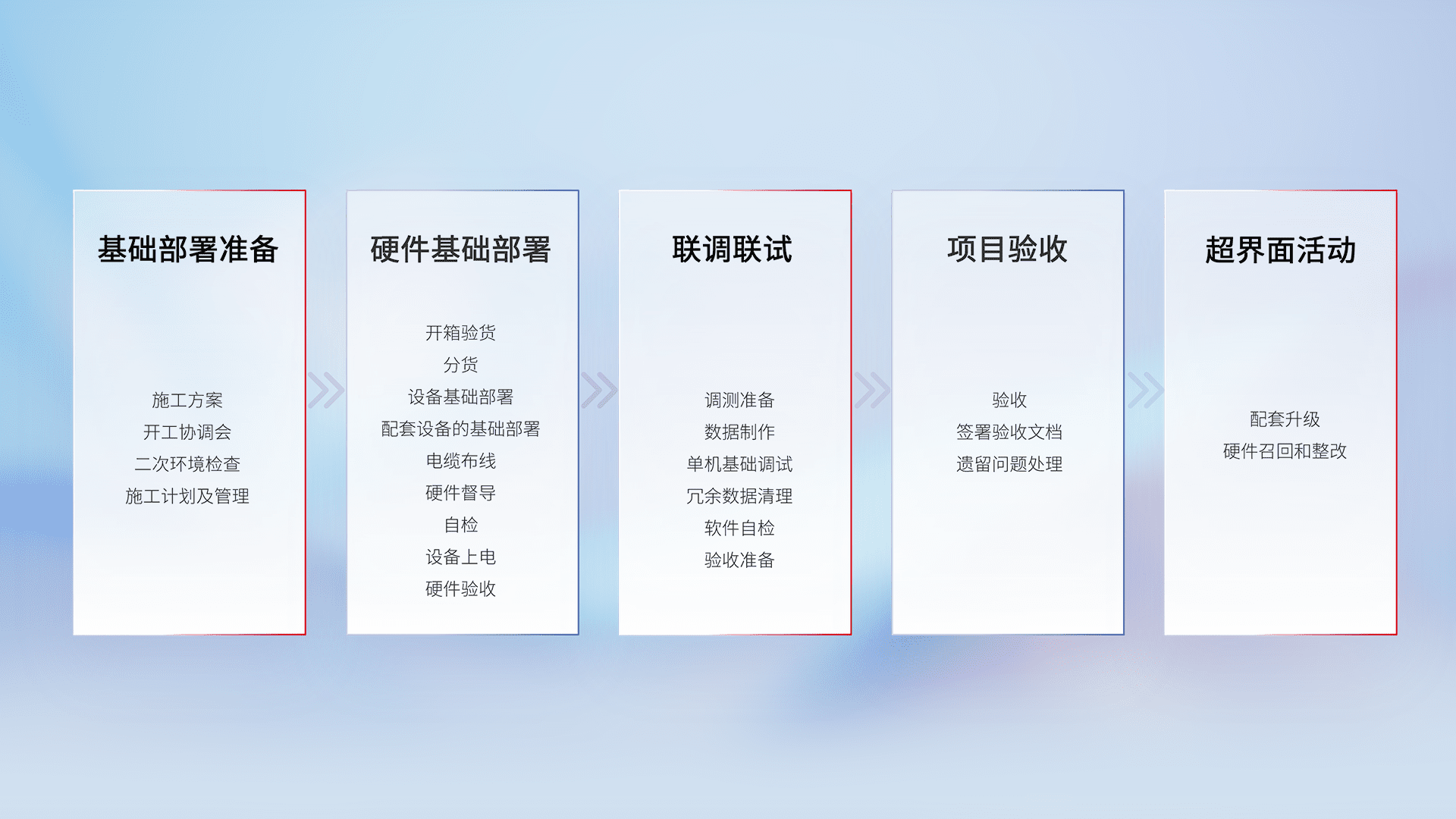 从基础部署准备、、、、硬件基础部署、、联调联试、、、、项目验收、、越界面活动的全过程可追溯,,保证施工质量和进度。。。。